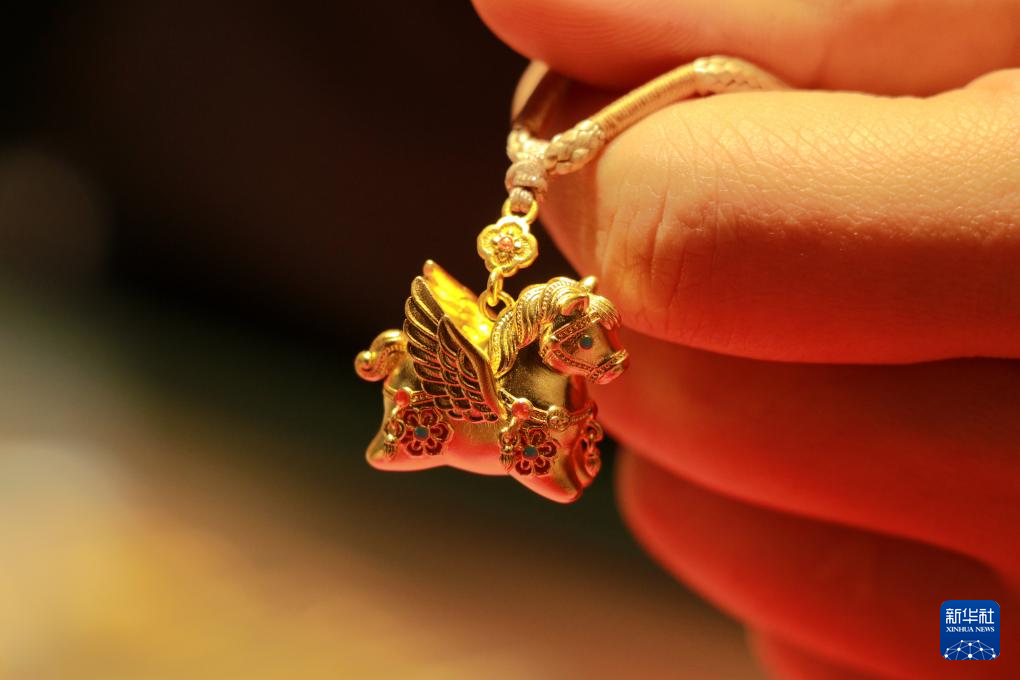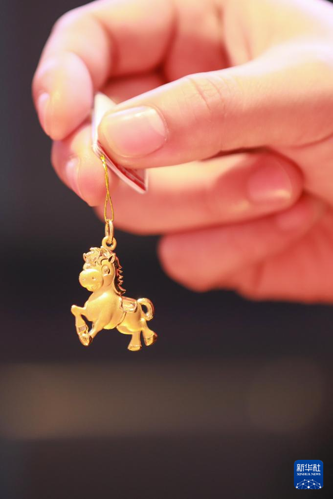 1月16日,在贵州省黔东南苗族侗族自治州从江县一家黄金店,店员在展示生肖马主题的黄金饰品。新华社发(罗京来摄)