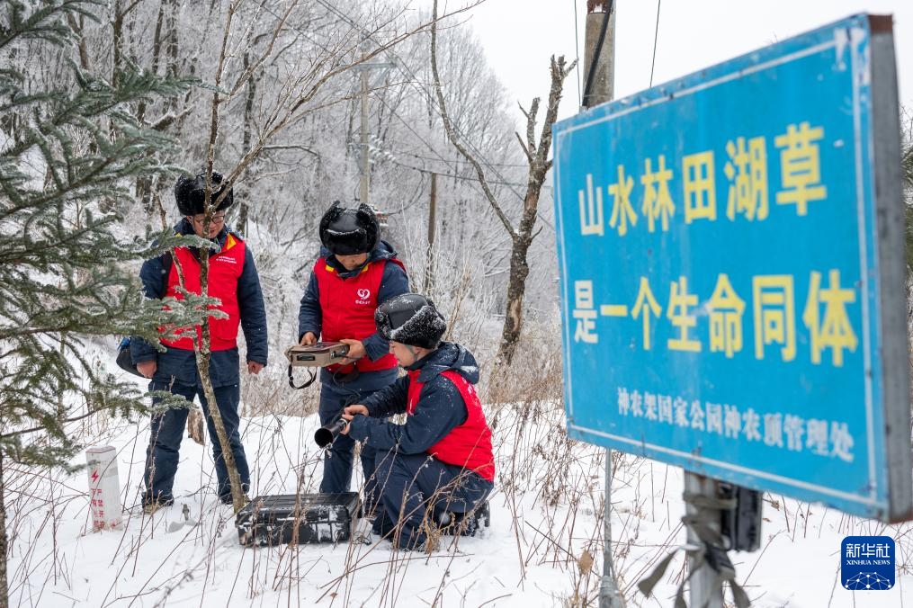 1月21日,在神农架林区木鱼镇,木鱼供电所运维人员检测线路设备是否有放电情况。新华社记者 伍志尊 摄