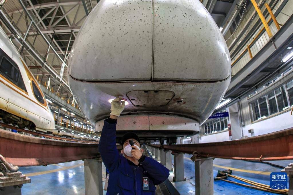 1月28日凌晨,工作人员在南京南动车运用所检修动车组列车。新华社发(杨素平 摄)