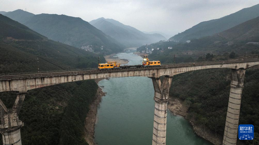 1月29日,中国铁路南宁局集团有限公司南宁供电段的接触网工在南盘江铁路大桥上检修接触网设备。新华社记者 张爱林 摄