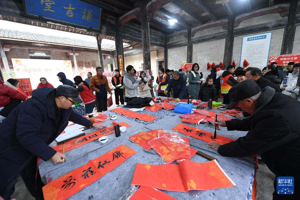 1月31日,书法爱好者在五泄镇十四都村古民居写春联送祝福。新华社记者 翁忻旸 摄