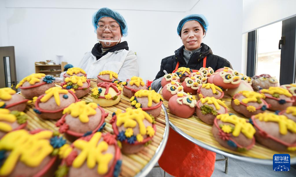 2月4日,在河南省洛阳市西工区红山街道枣园社区花馍工坊内,工人展示制作好的花馍。新华社发(黄政伟摄)