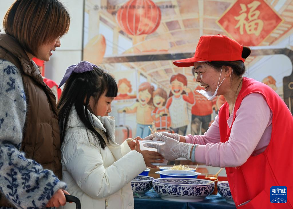 2月13日,在江苏镇江站,爱心面馆工作人员为旅客送锅盖面。新华社发(辛一摄)