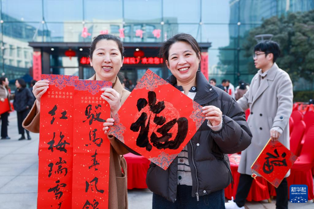 2月13日,在江苏省泰州市美术馆西广场,市民手拿书法家现场书写的福字和春联合影留念。新华社发(顾继红摄)