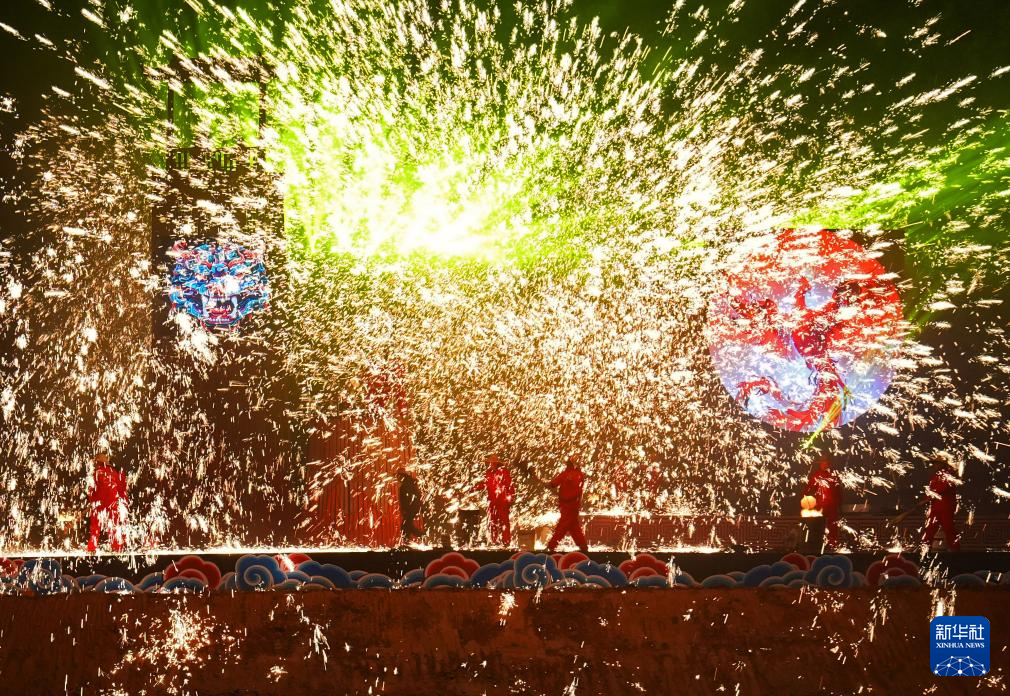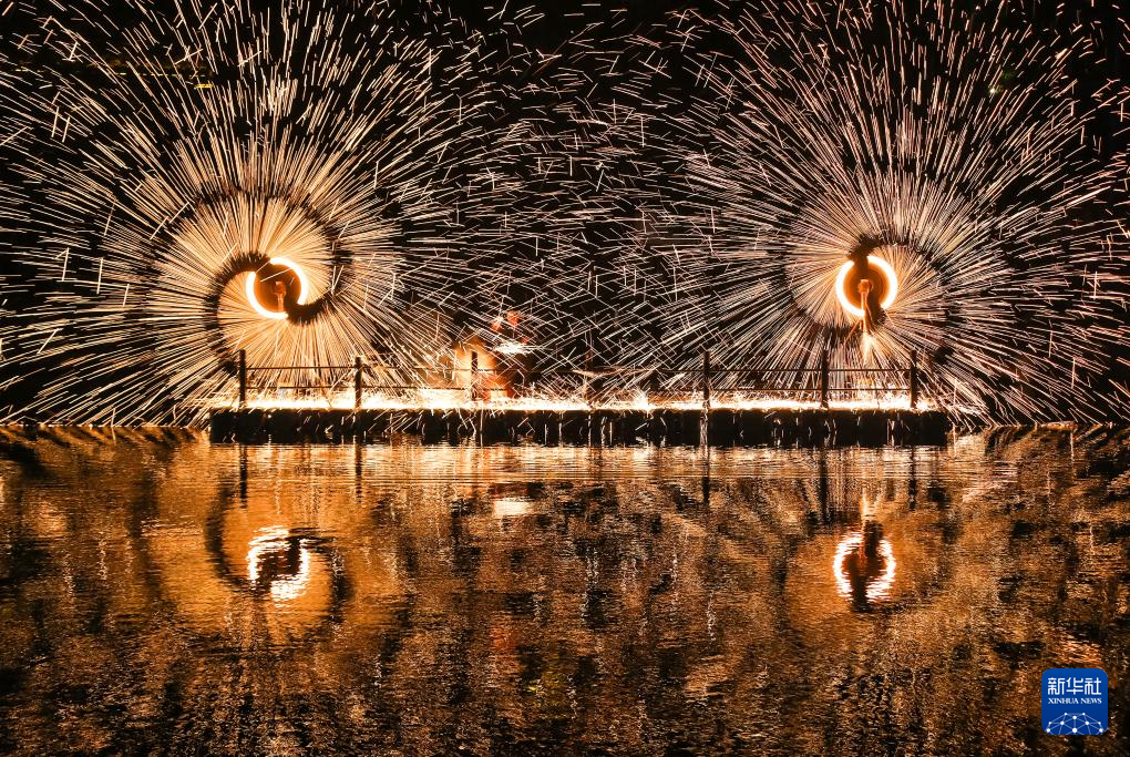 2月13日,在湖南省衡阳市南岳区1944景区,民间艺人表演打铁花。新华社发(曹正平摄)