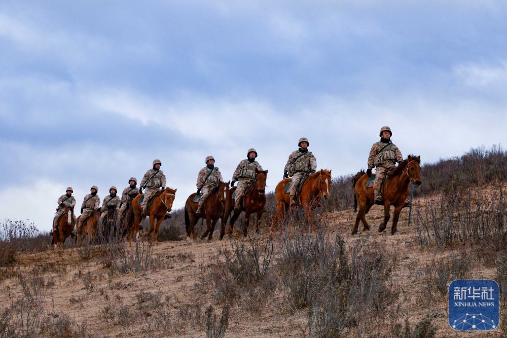 ↑ 2月15日,陆军第76集团军某旅玉树独立骑兵连官兵在海拔4000余米的巴塘草原巡逻。新华社发(周柯毅 摄)