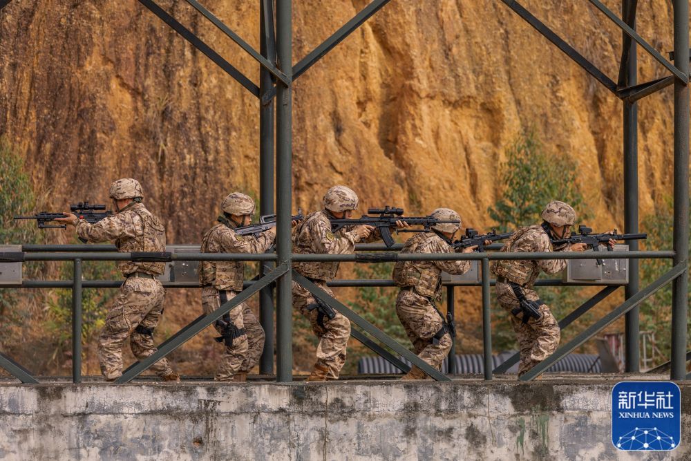 ↑ 2月16日,武警广西总队来宾支队组织官兵进行小组战术搜索训练。新华社发(果志远 摄)