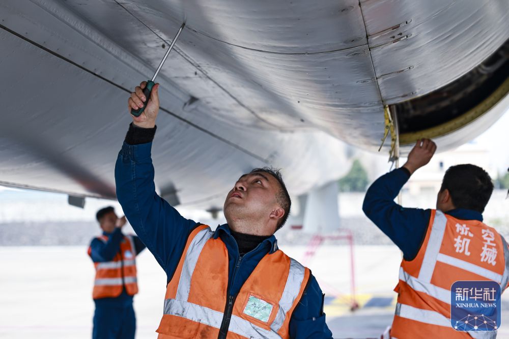 ↑ 2月15日,南部战区空军航空兵某部,机务官兵对春节期间值班战机进行检查维护。新华社(黄子畅 摄)