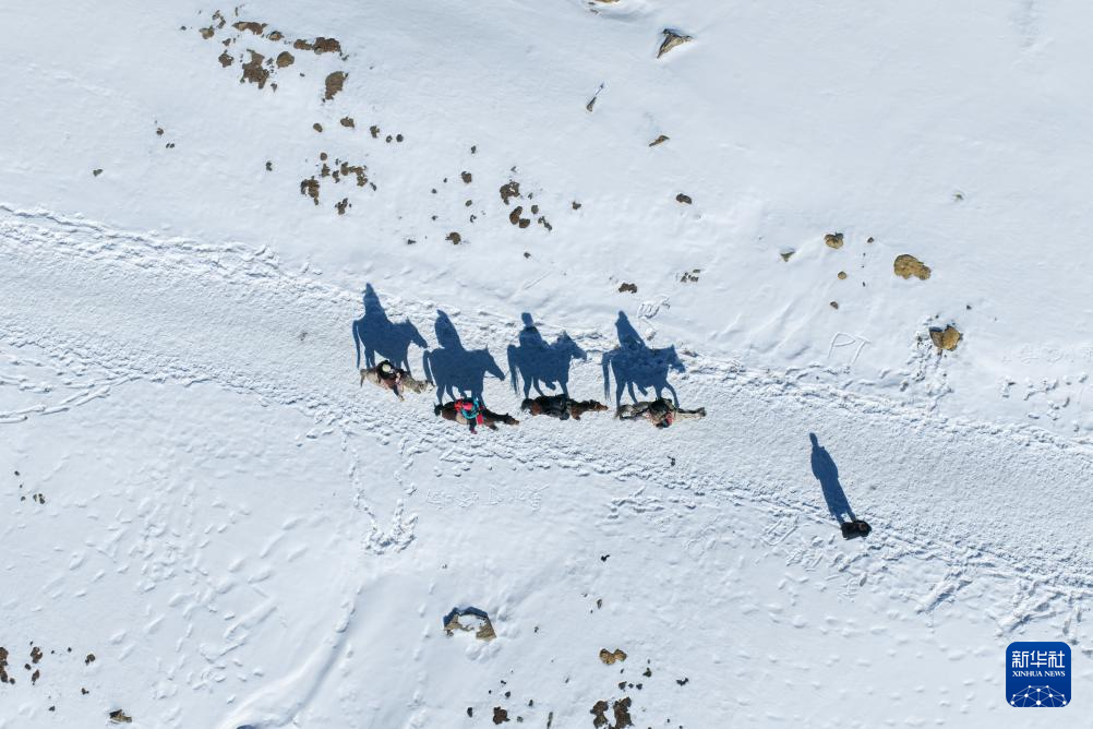 2月20日,游客在位于青海省海北藏族自治州门源回族自治县的岗什卡雪山体验骑马(无人机照片)。新华社记者 张龙 摄