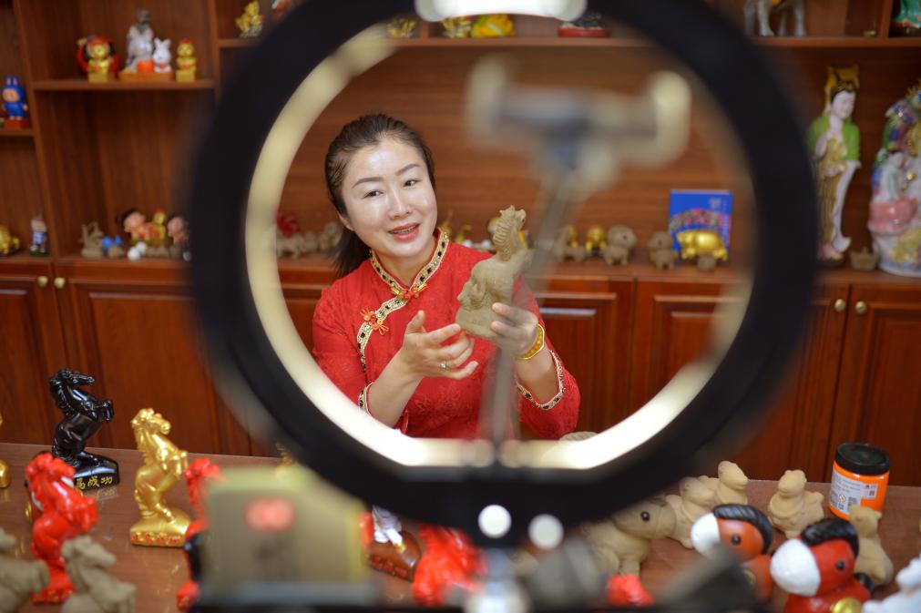 1月21日,在山东省青岛市城阳区河套街道汇海社区泥塑非遗工坊,主播通过网络直播销售。新华社发(王海滨 摄)