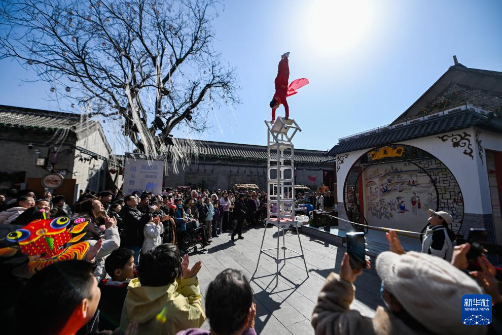 2月22日,游客在杨柳青古镇观看杂技表演。