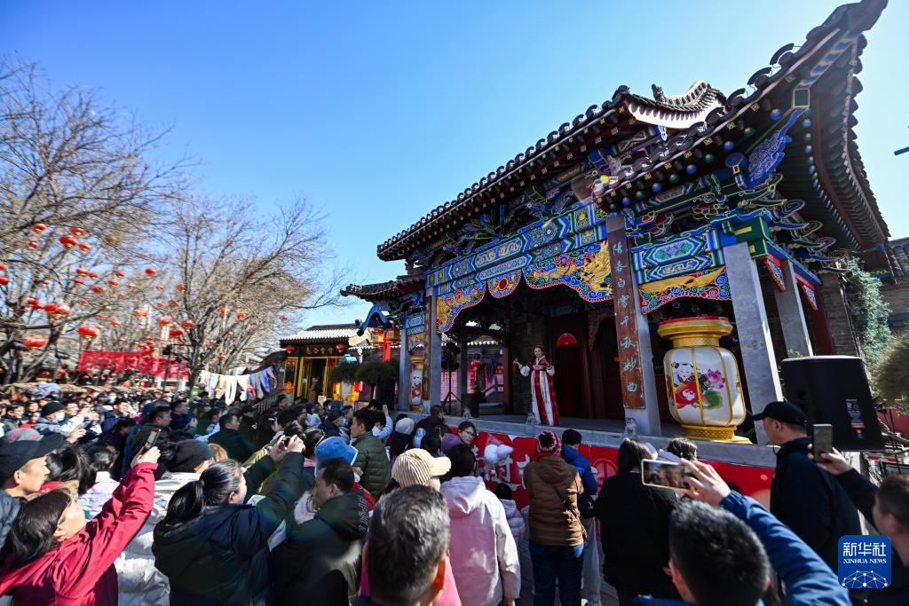 2月22日,游客在杨柳青古镇观看演出。