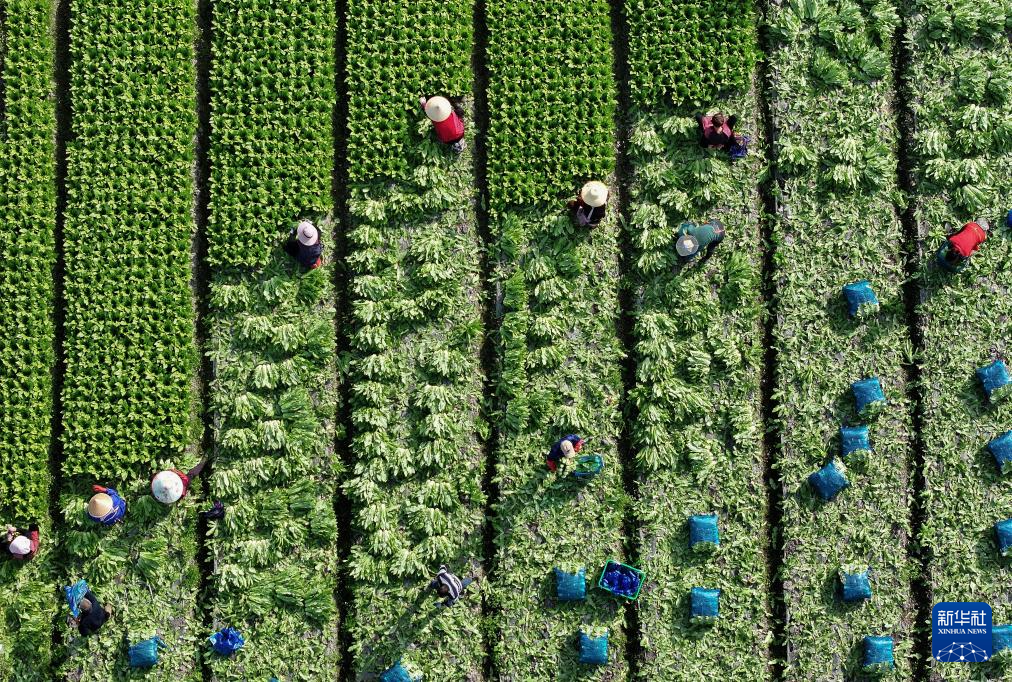 2月24日,农民在四川成都市彭州市九尺镇玉源社区的田地里采收油麦菜(无人机照片)。新华社发(罗国杨摄)