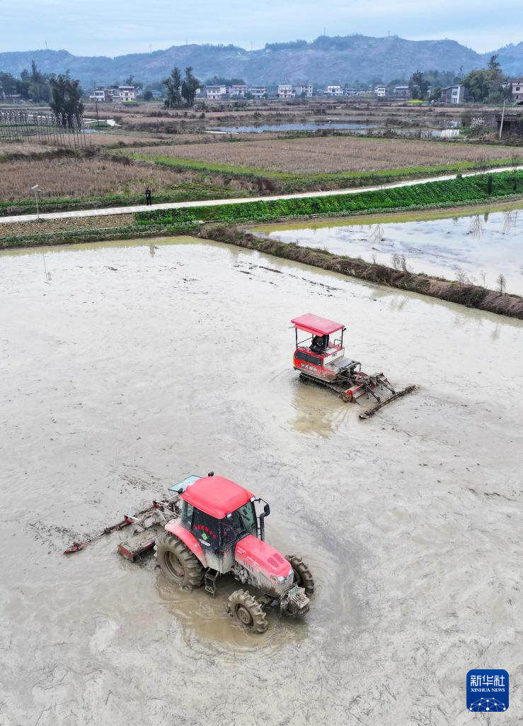 2月24日,重庆市梁平区星桥镇两路村,农机手驾驶拖拉机耕田(无人机照片)。新华社发(刘辉摄)
