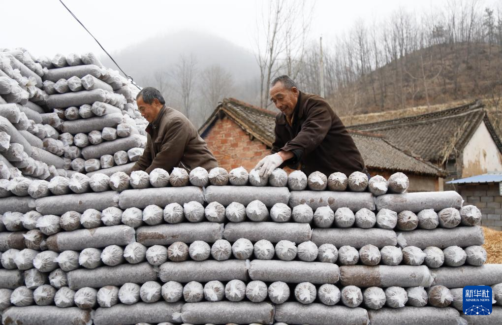 2月25日,河南省洛阳市汝阳县王坪乡大庄村村民在搬运袋料香菇。新华社发(康红军摄)
