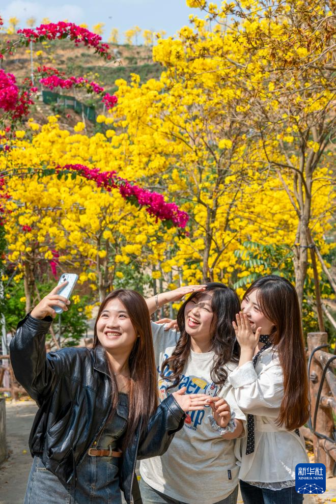 广西梧州市甜蜜家生态蜂业园连片的黄花风铃木盛放,游客在赏花拍照(3月7日摄)。新华社发(何华文摄)