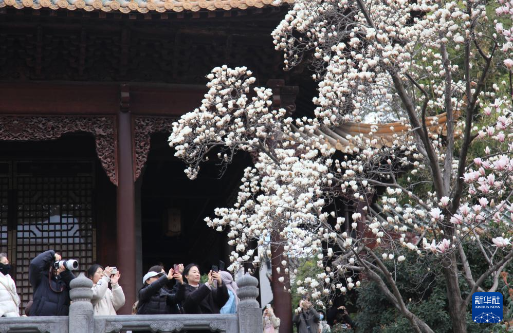 3月8日,游客在江苏扬州何园景区欣赏玉兰花。新华社发(齐立广摄)