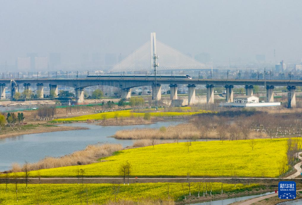 春日,在安徽省合肥市肥东县十八联圩生态湿地,油菜花竞相绽放,铺展成金色花海。高铁列车穿行其间,与碧水、飞鸟相映成趣,勾勒出一幅生动多彩的江淮大地春日图景。