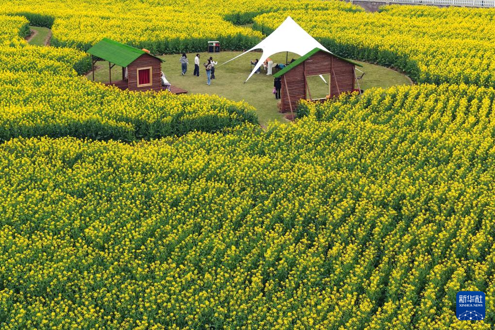 3月21日,在贵州省黔东南苗族侗族自治州施秉县城关镇上翁哨村,家长陪同孩子在油菜花田间荡秋千。新华社发(邰胜智 摄)