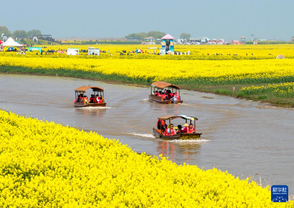 3月22日,游人在江苏省高邮市湖上花海景区游玩(无人机照片)。新华社发(周社根摄)