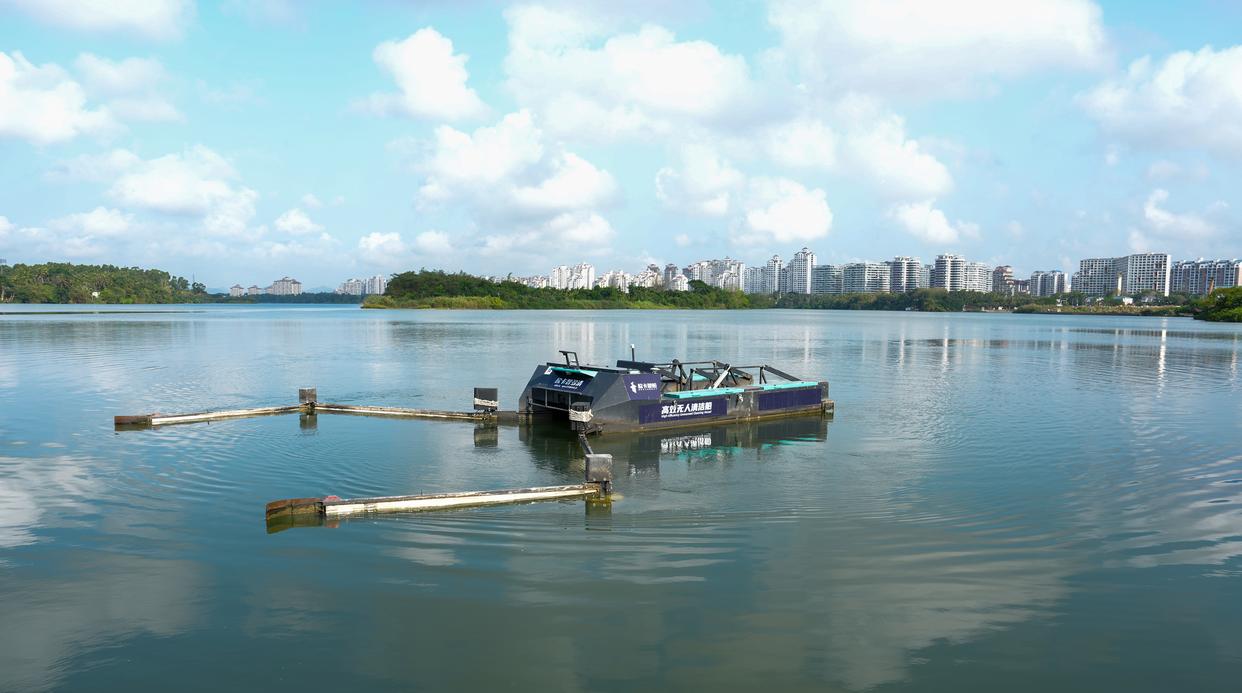 水上智慧环卫无人清洁船在万泉河水面作业(3月25日摄)。新华社记者 杨冠宇 摄