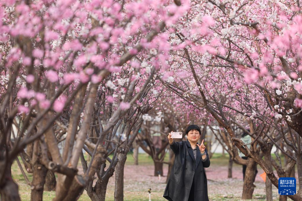 3月26日,游人在河北省石家庄市石津灌渠文化公园赏花拍照。新华社发(陈其保摄)