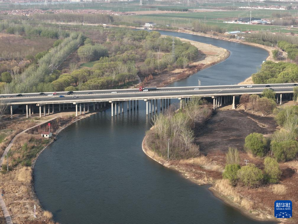 4月4日拍摄的京杭大运河天津武清段的春天景色(无人机照片)。新华社记者 邢广利 摄