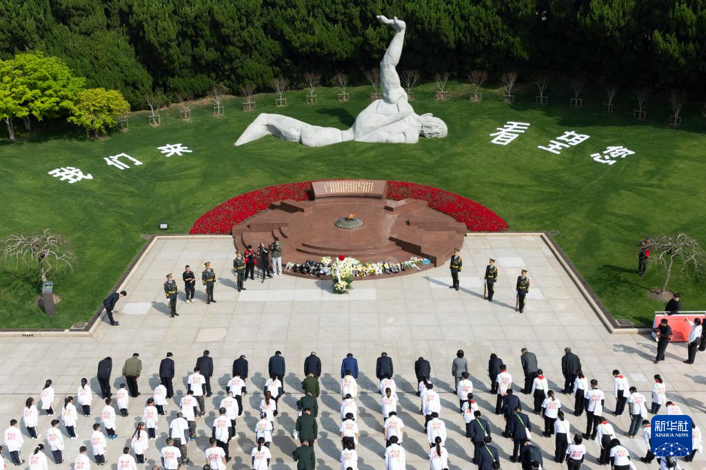 4月5日,武汉市武昌区滨江实验第一小学师生、武汉客运段乘务员代表在武汉二七纪念馆开展祭奠先烈活动(无人机照片)。新华社发(赵军 摄)