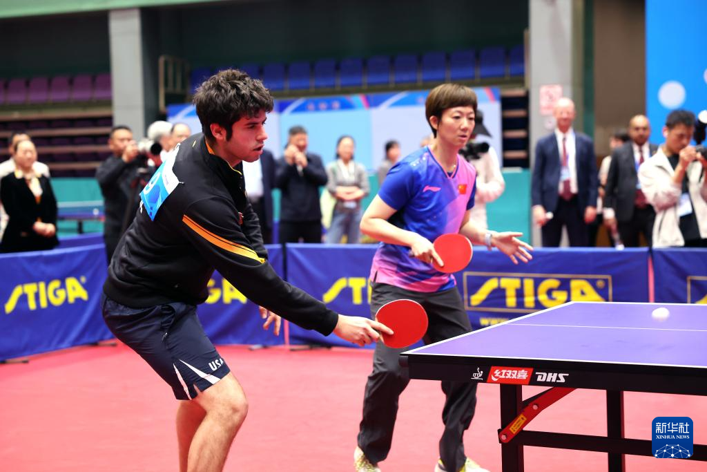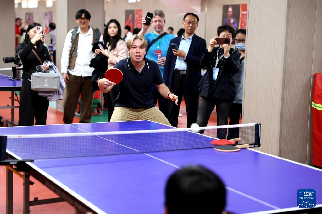 4月11日,参加活动的运动员、体育界人士在河北正定国家乒乓球训练基地进行乒乓球友谊赛。新华社记者 卢烨 摄