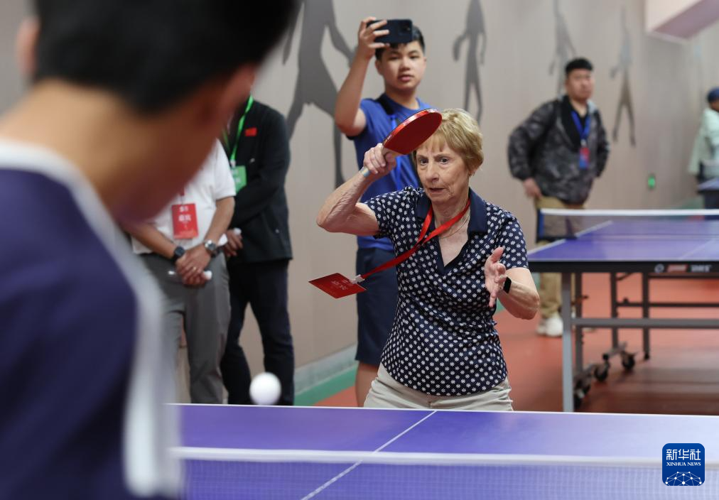 4月11日,中美“乒乓外交”亲历者康妮·史维利斯在石家庄外国语学校与学生进行乒乓球友谊赛。新华社记者 卢烨 摄