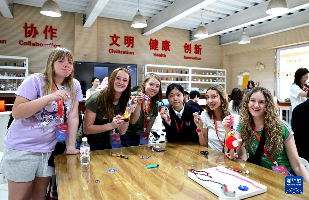 4月11日,美国学生在石家庄外国语学校展示手工课作品。新华社记者 卢烨 摄