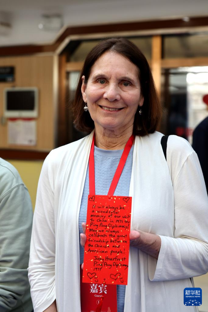 4月11日,中美“乒乓外交”亲历者朱迪·霍夫罗斯特展示手写的贺卡。新华社记者 卢烨 摄