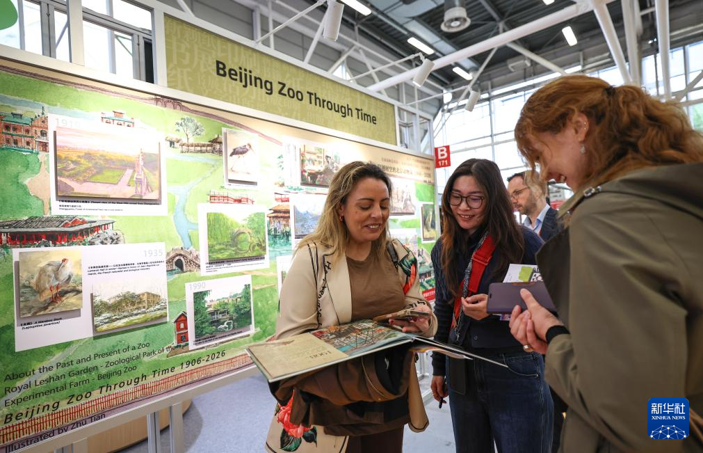 4月14日,在意大利博洛尼亚,参展商在第63届博洛尼亚国际儿童书展“穿越时空的北京动物园”微展览前介绍插画作品。新华社记者 王楷焱 摄