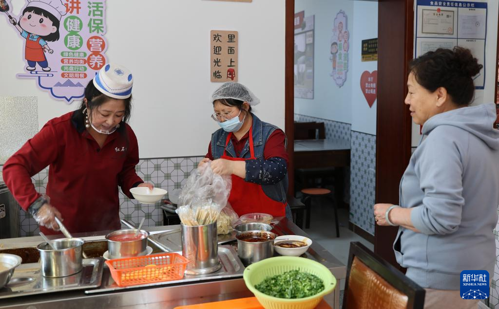 4月14日,社区居民在红石榴大食堂就餐。新华社记者 李然 摄