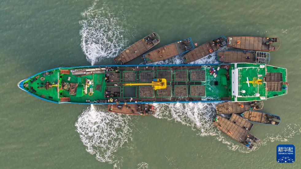 4月18日,在山东省荣成市爱伦湾,养殖工人将从福建“越冬”归来的鲍鱼转运到养殖海域(无人机照片)。新华社发(李信君 摄)