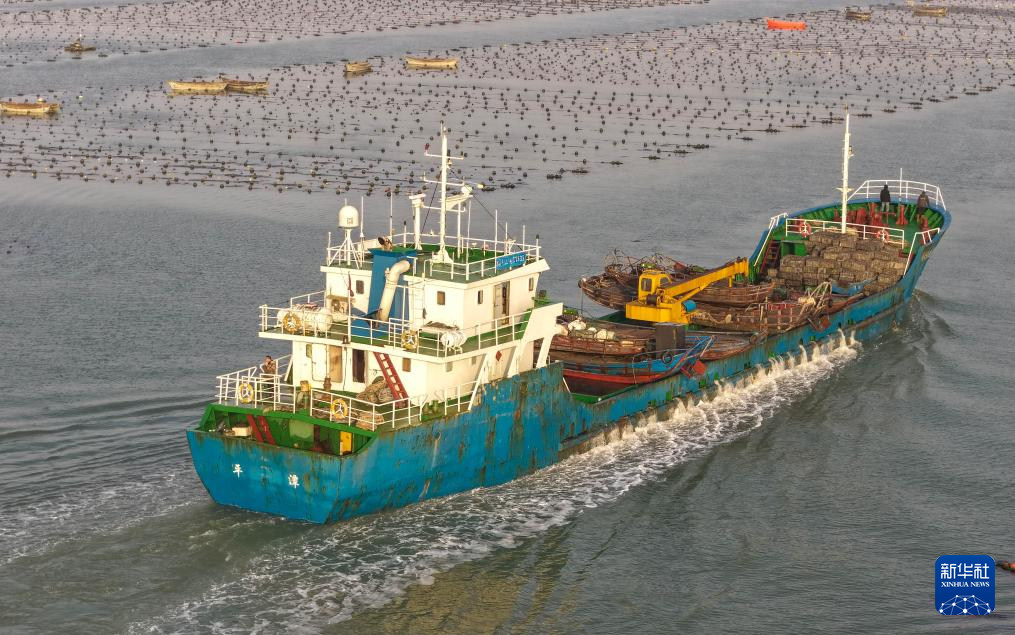 4月18日,满载鲍鱼的运输船前往山东省荣成市爱伦湾卸运(无人机照片)。新华社发(李信君 摄)