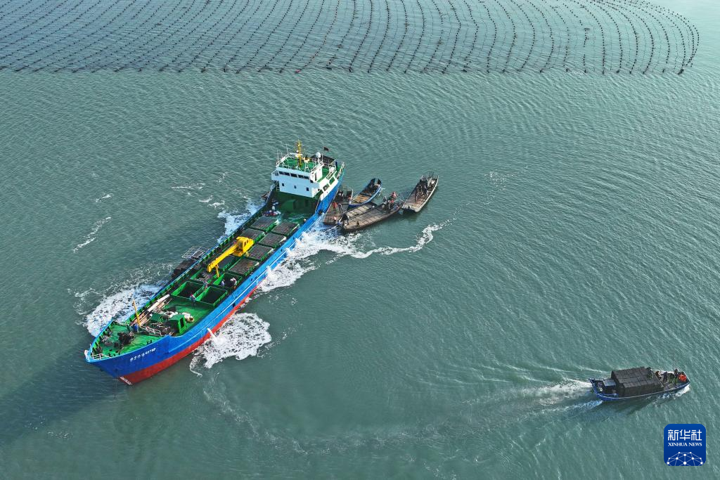 4月18日,在山东省荣成市爱伦湾,养殖工人将从福建海域“越冬”归来的鲍鱼转运到养殖海域(无人机照片)。新华社发(王福东 摄)