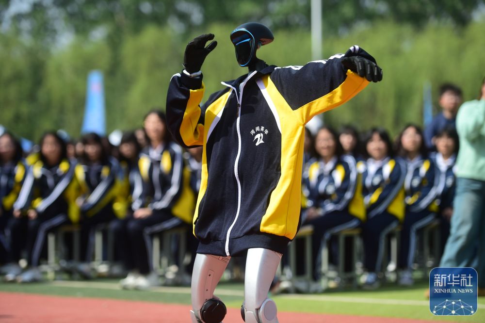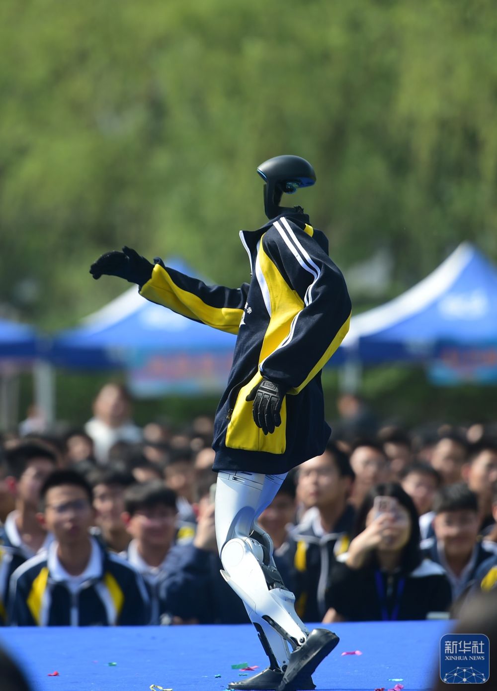 ↑ 4月18日,智能机器人在校园科技节开幕式上跳舞。新华社发(傅新春摄)