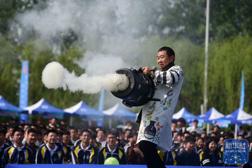 ↑ 4月18日,学生在校园科技节上参与“等离子大炮”科学实验。新华社发(傅新春摄)