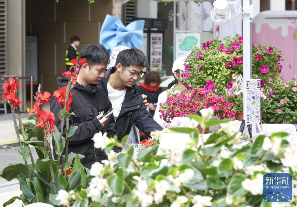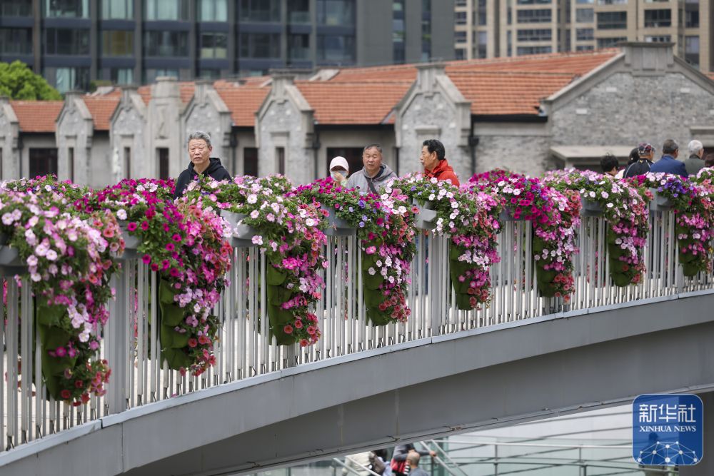 ↑ 4月18日,人们在上海市静安区万象天地花卉市集上游览。新华社记者 王翔 摄