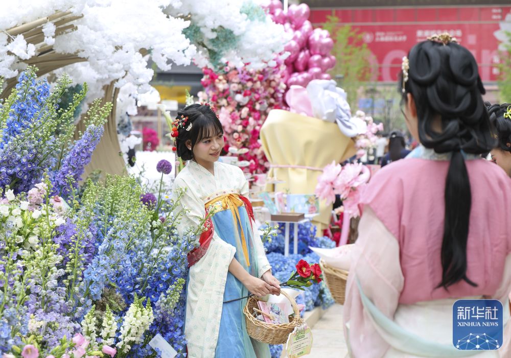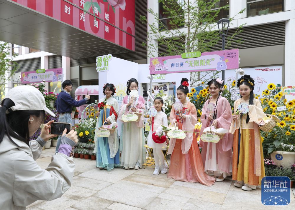 ↑ 4月18日,游客在上海市黄浦区新天地东台里举办的花卉市集上打卡拍照。新华社记者 陈浩明 摄