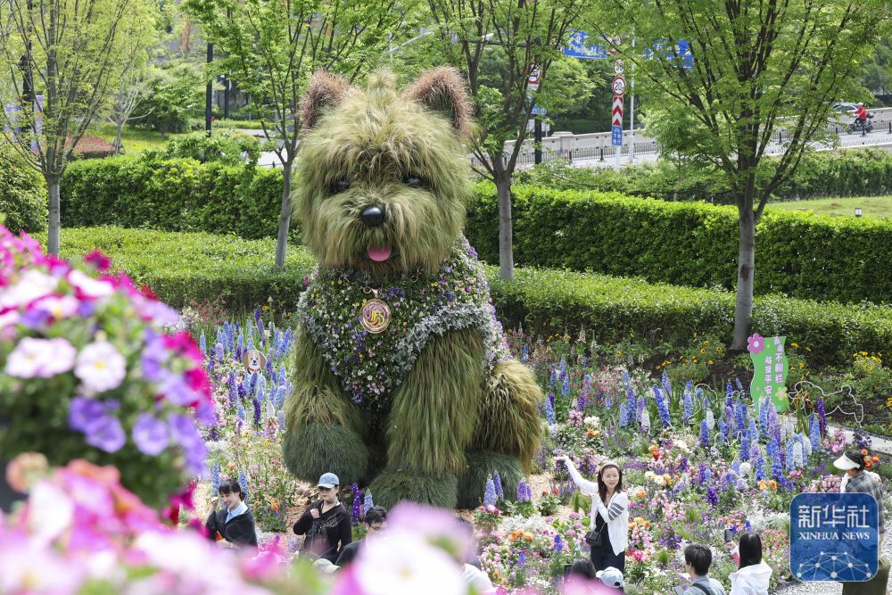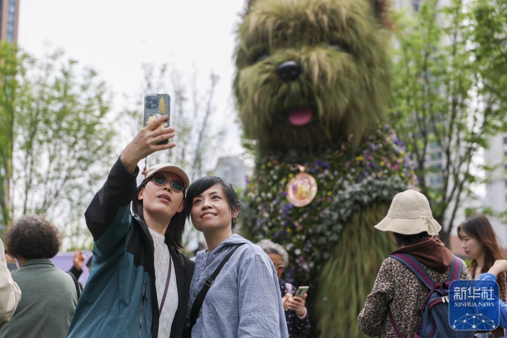 ↑ 4月18日,游客在上海市静安区万象天地花卉市集上和“潦草小狗”打卡合影。新华社记者 王翔 摄