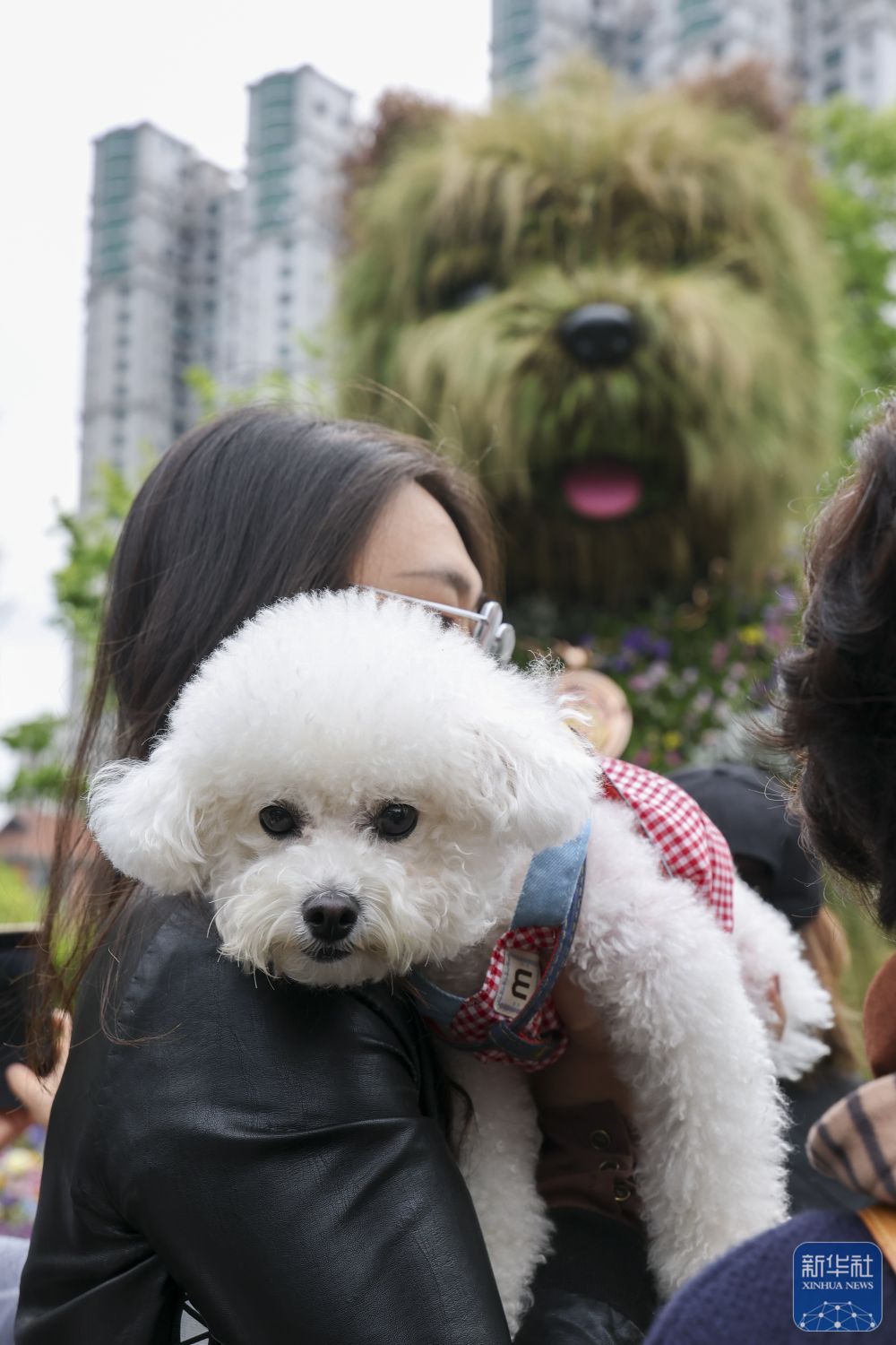 ↑ 4月18日,市民携带宠物在上海市静安区万象天地花卉市集上和“潦草小狗”打卡合影。新华社记者 王翔 摄
