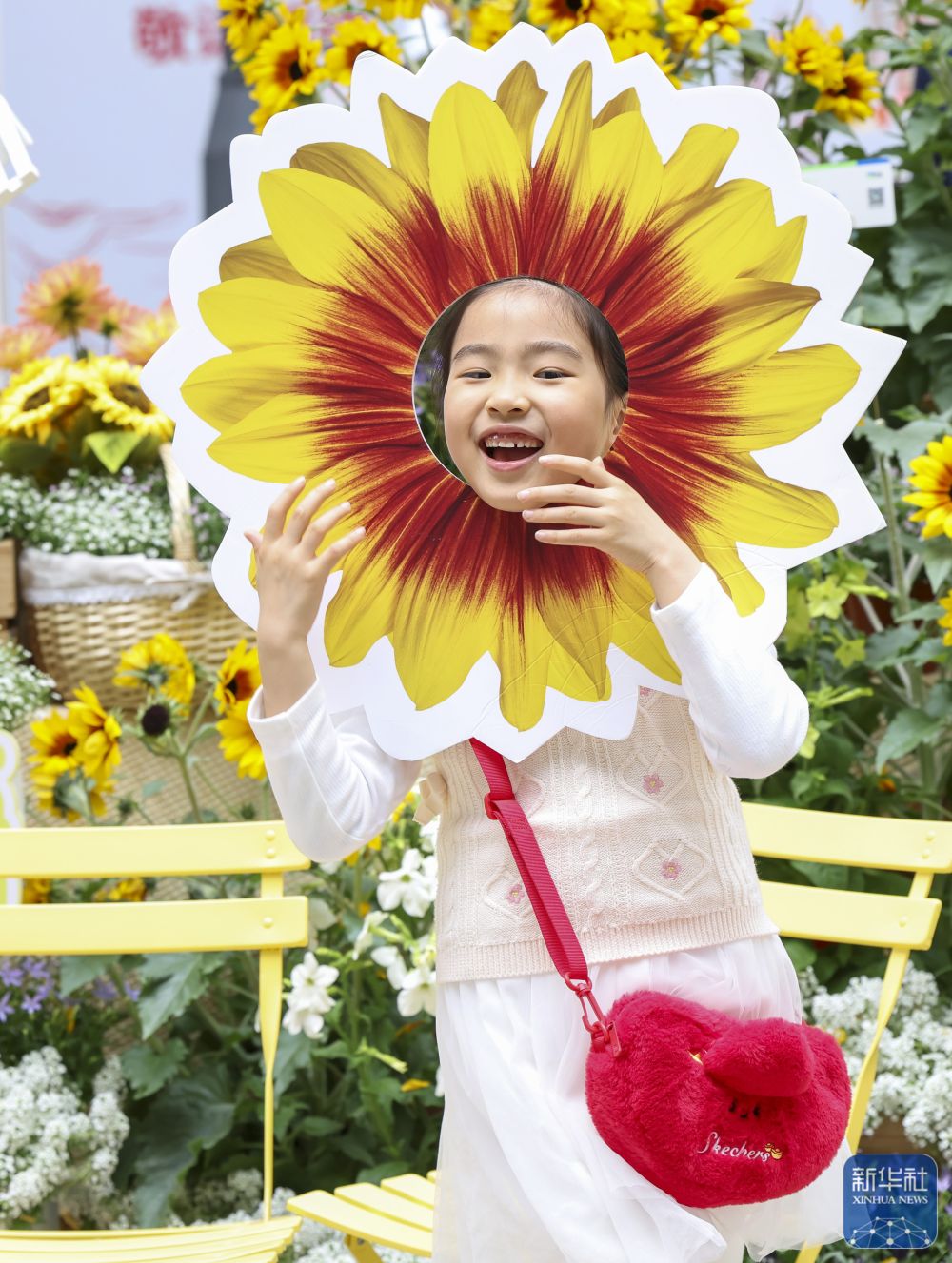 ↑ 4月18日,小女孩在上海市黄浦区新天地东台里举办的花卉市集上打卡拍照。新华社记者 陈浩明 摄
