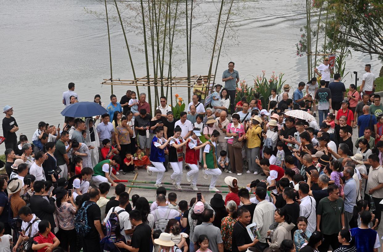 4月19日,2026年“广西三月三·八桂嘉年华”文化旅游品牌活动继续在南宁市民歌湖举行,游客观看跳竹竿舞表演。新华社记者 陆波岸 摄