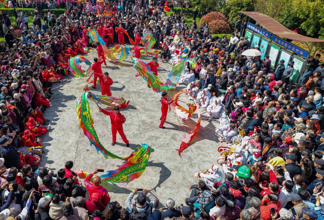 4月19日,村民在江苏省泰州市海陵区唐甸村“三月三”传统庙会上进行舞龙表演(无人机照片)。新华社发(汤德宏 摄)