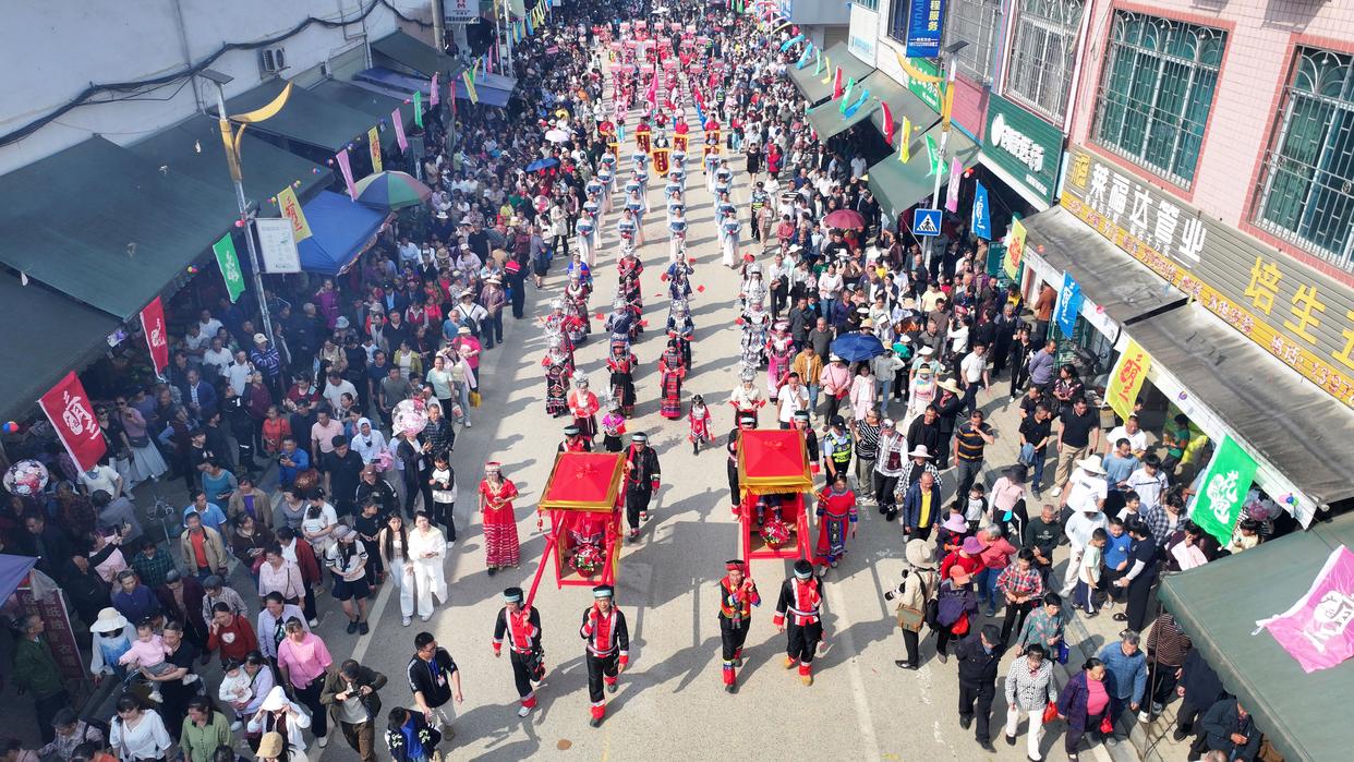 4月19日,在广西柳州市融安县板榄镇,各族群众身着民族盛装参加“三月三”民俗文化巡游(无人机照片)。新华社发(谭克兴 摄)