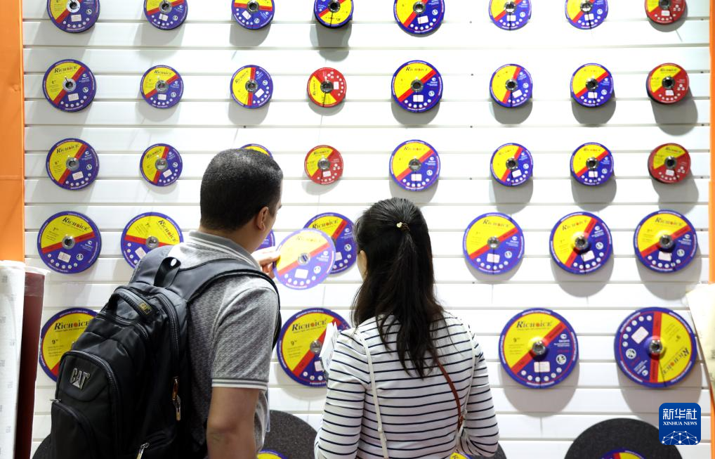 4月19日,采购商在广交会上参观选购磨砂轮。新华社记者 卢汉欣 摄