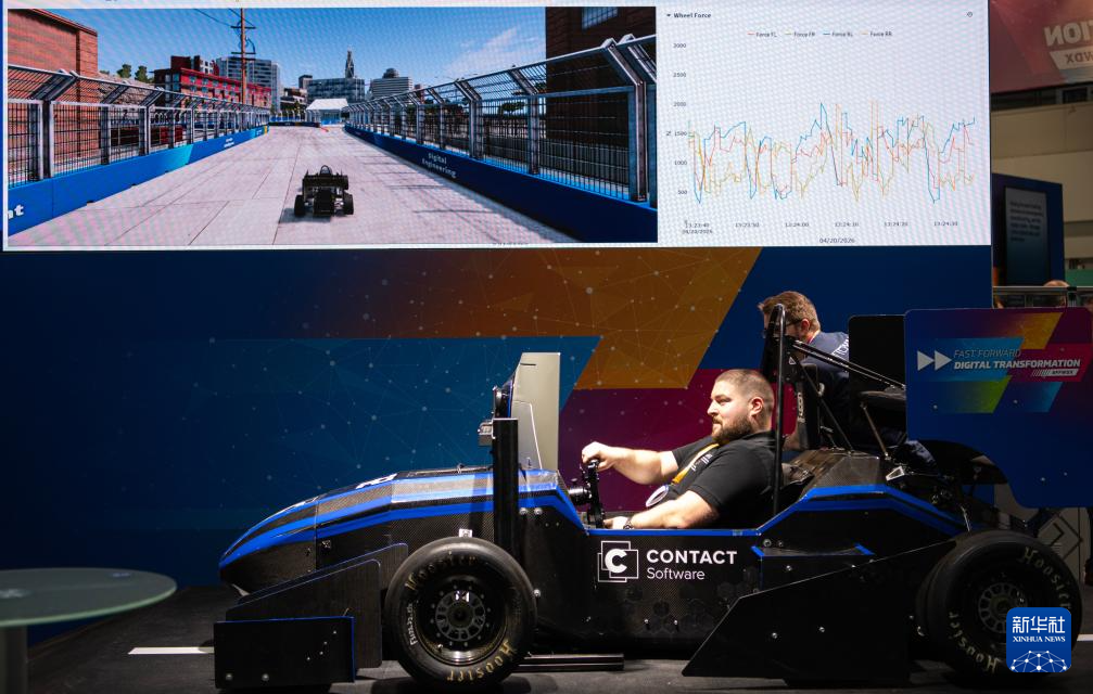 4月20日,一名男子在德国汉诺威工业博览会体验一款赛车模拟设备。新华社记者 张豪夫 摄