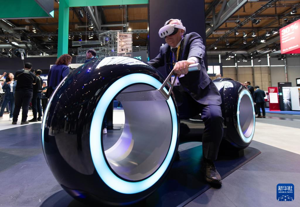 4月20日,一名男子在德国汉诺威工业博览会西门子展区体验一款VR设备。新华社记者 张豪夫 摄